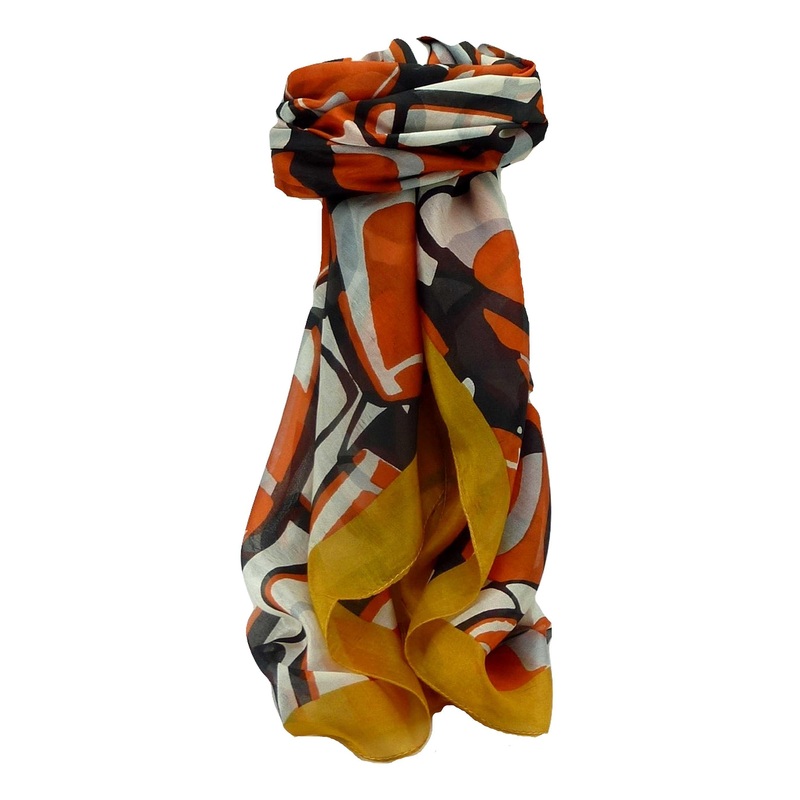 Elegant 100% Prime Quality silk scarves from our Traditional and Classic ranges each with Contemporary Designs. Our long scarves measure approximately 100cm x 100cm. They are spun, woven and hand printed by cottage industries in Kashmir. These classic, elegant scarves represent a chic interpretation of traditional Kashmir craftsmanship. They are made from cultivated Mulberry Silk, the finest and most expensive silk available. It is softer, rounder, finer and smoother than raw silk harvested from the wild. Our silk scarves have a smooth, silky, luxurious feel.