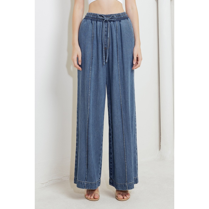 A washed woven pant with elasticized waist with front tie and wide leg. Matching top FT1582Details:Self : 82% Lyocell 18% CottonSize & Fit- Model is 5`8" And Wearing Size Small- Measurements Taken From Size Small- Approx. Length: 44"