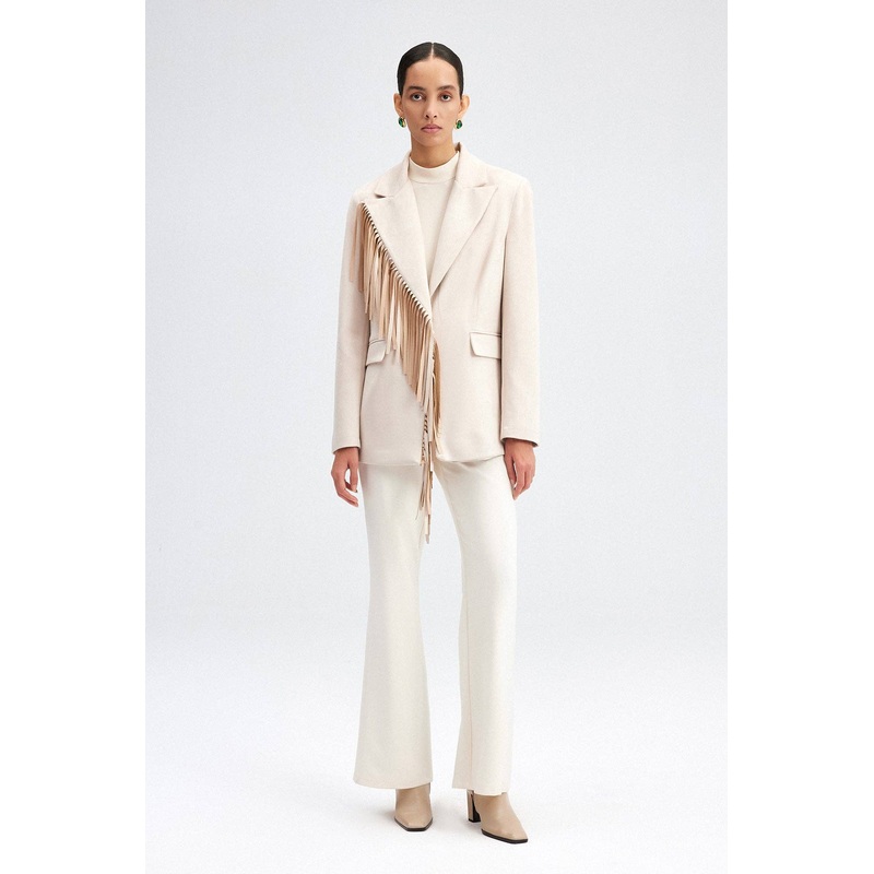 Elevate your wardrobe with our cream tassel blazer jacket! Sophistication meets fun with this stylish piece, perfect for completing any outfit. Stand out from the crowd and add a touch of playfulness to your ensemble. Make a statement with our TASSEL BLAZE