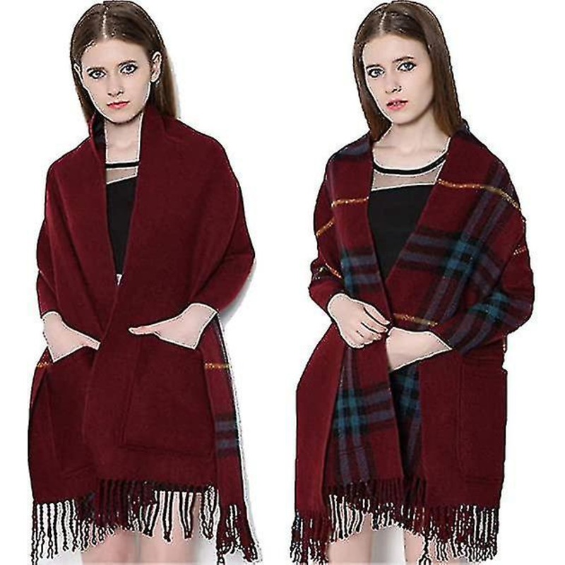 Tassel Scarf Cashmere Double Sided Lattice Scarf Wiht Pocket Wrap Warm Fashion Ladies Scarf Shawl Wine Red 1pc | Fruugo SG